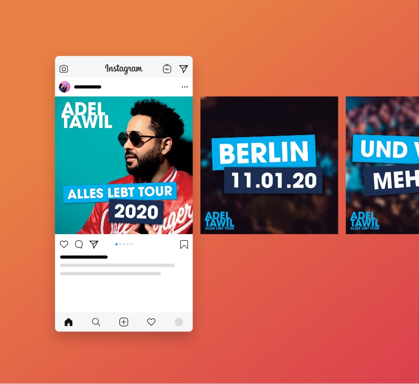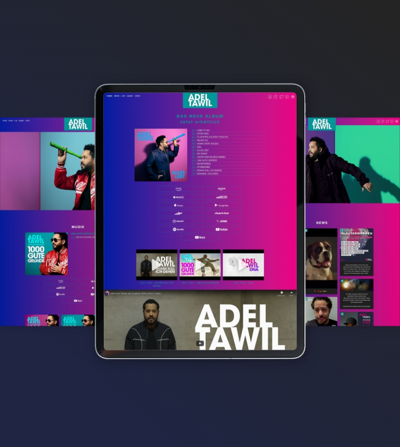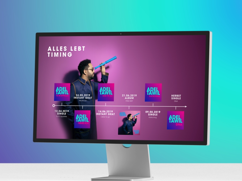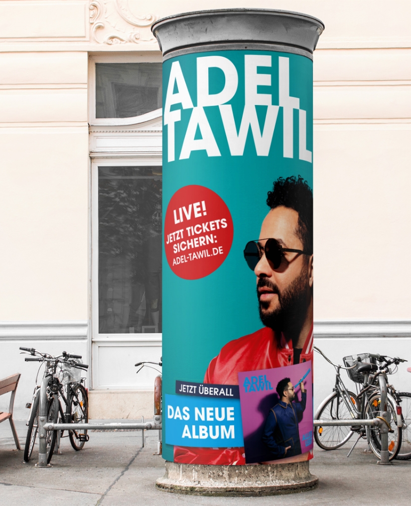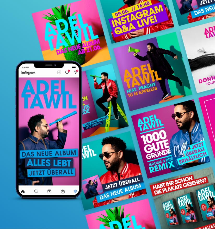 Den deutschen Musiker und Songwriter Adel Tawil durften wir zwei Jahre lang intensiv begleiten. Besonders positiv ist uns hier das Projekt um das Packaging und die Vermarktung des Hit-Albums „Alles lebt“ in Erinnerung. Neben der Gestaltung der CD, der LP und des Booklets durften wir werbetechnisch mit Großflächenbeklebungen und Social Media Beiträgen die Vermarktung des Albums unterstützen. Eine willkommene Zusammenarbeit unter Kreativen.